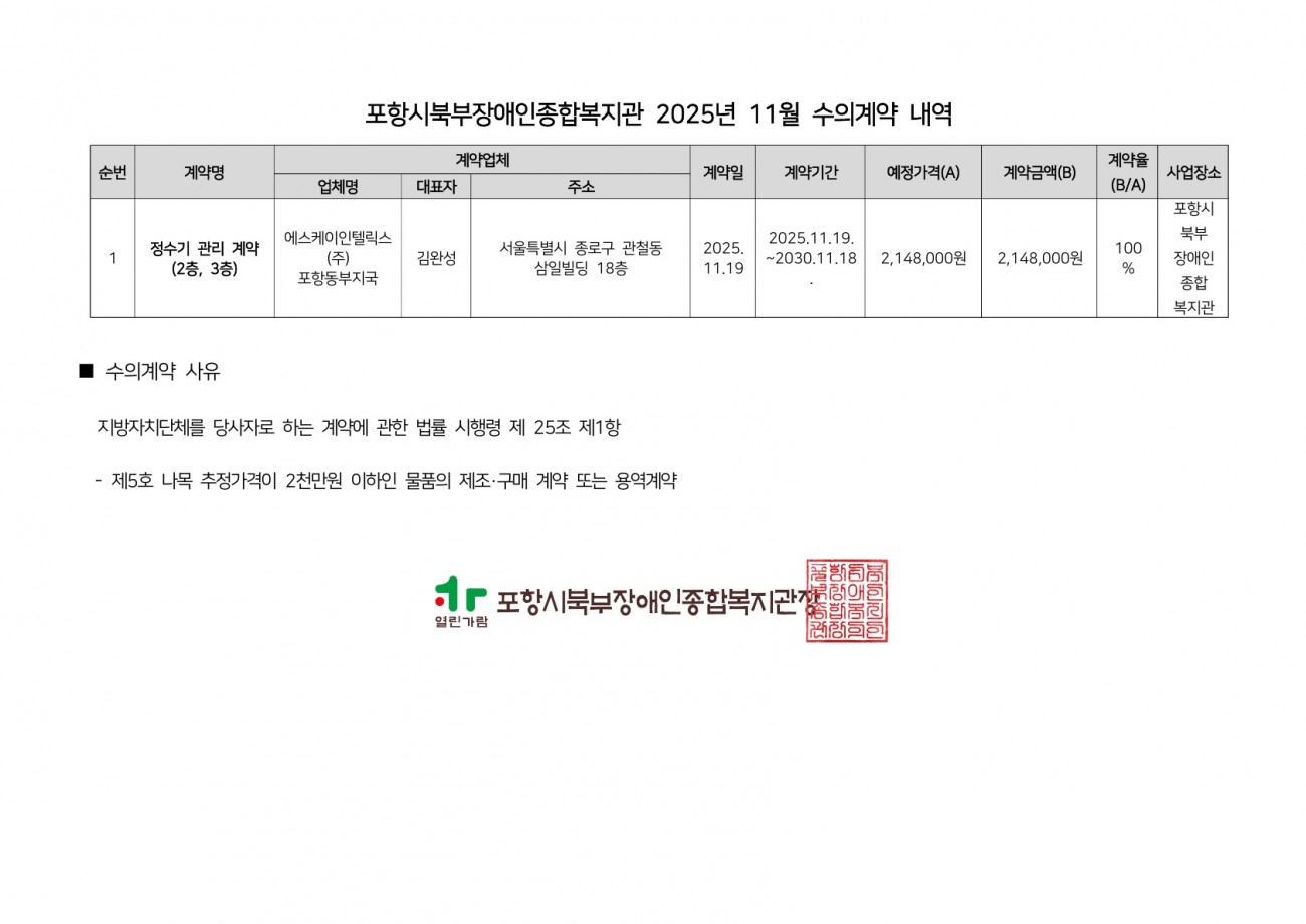 포항시북부장애인종합복지관 2025년 11월 수의계약 내역 공개