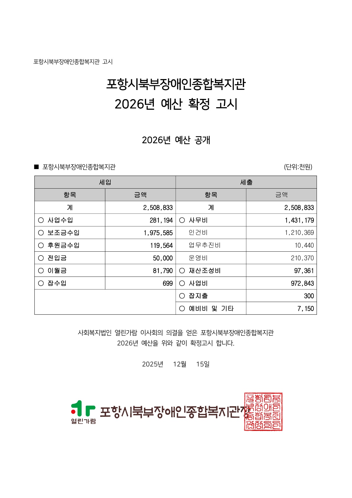 2026년도 예산 확정 고시 최고관리자 0 101 2025.12.15 14:31 2025.12.15 14:31 2026년 초회 사업계획 및 세입세출예산서포항시북부장애인종합복지관_공개.pdf (603.1K) + 5 {이미지:0}