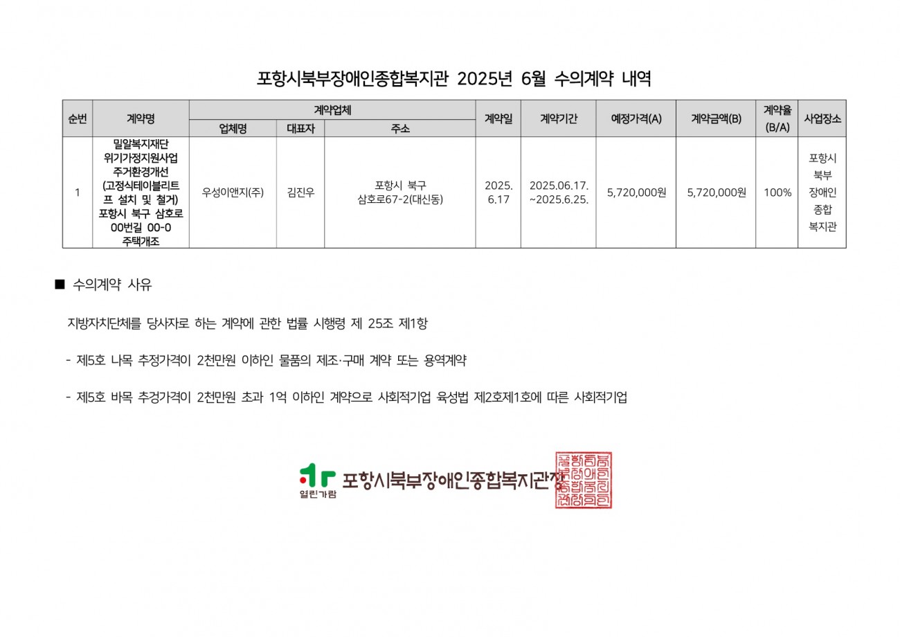 포항시북부장애인종합복지관 2025년 6월 수의계약 내역 공개