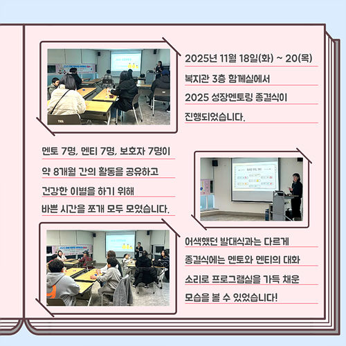 봄바람이 살랑살랑 불어오는 4월 어색함과 기대감으로 가득 채웠던 발대식을 시작으로 2025 성장멘토링 사업을 시작한지 며칠이 지나지 않은 것 같은데 벌써 종결식을 진행하며 사업이 마무리되었습니다.