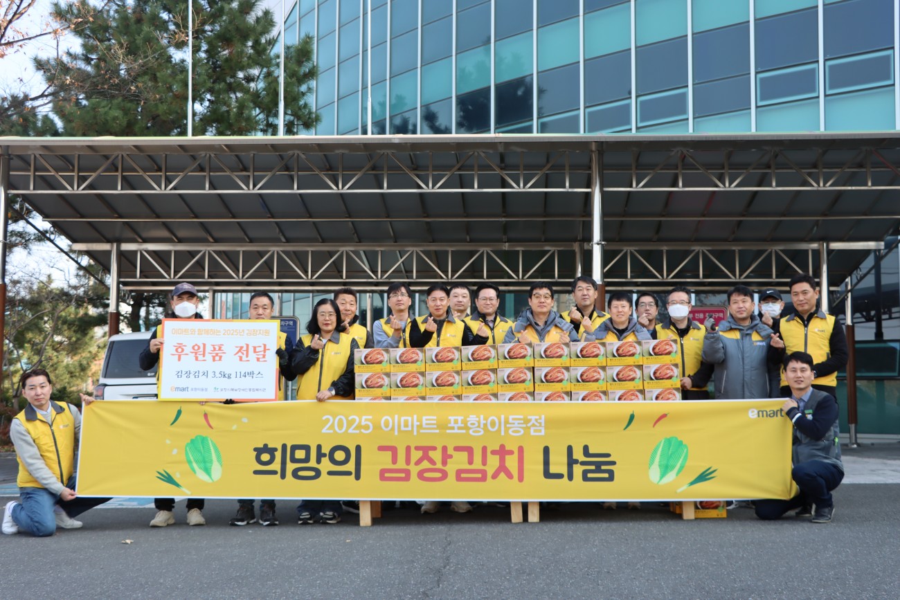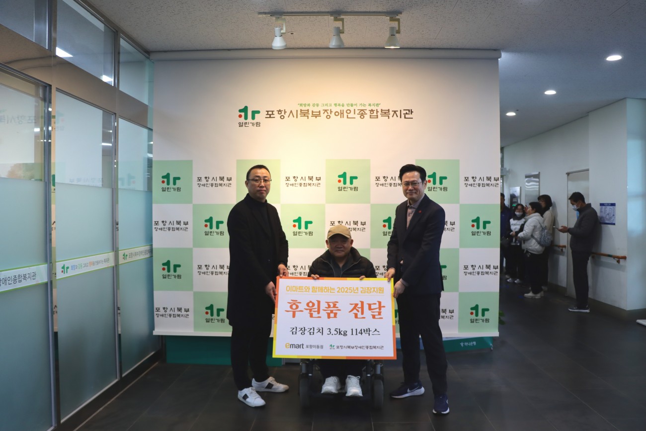 e-mart 포항이동점 후원품 전달식 진행 최고관리자 0 151 2025.11.26 15:52 < e-mart 포항이동점 후원품 전달식 진행>이마트 포항이동점에서 김장김치 114박스를 전달해주셨습니다.소중히 전달해주신 김치는 지역내 장애인분들에게 전달됩니다.