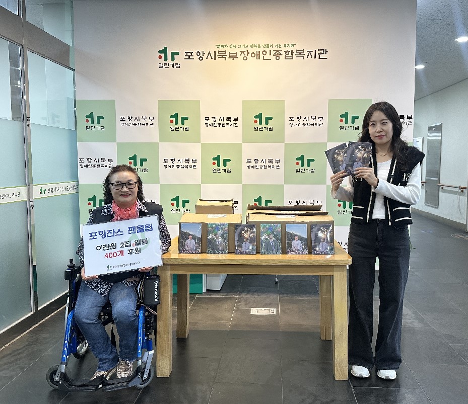 포항 찬스 후원품 전달식 진행 최고관리자 0 205 2025.10.24 18:19 <이찬원 팬클럽 포항찬스 후원품 전달식 진행>이찬원 팬클럽 포항 찬스에서 400만원 상당의 이찬원 2집 앨범을 전달해주셨습니다.소중히 전달해주신 후원품은 장애인을 위해 사용됩니다.