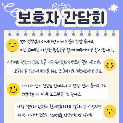 보호자님들의 소중한 의견을 모아 남은 하반기에도 성장멘토링 활동이 원활하게 이루어질 수 있도록 최선을 다하겠습니다 :)