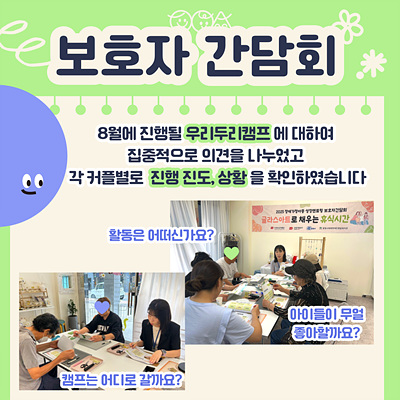또한 7월~11월 진행될 사업 계획을 안내드리며 8월 우리두리캠프 실시와 관련해 보호자님들과 집중적으로 의견을 교환하였습니다.