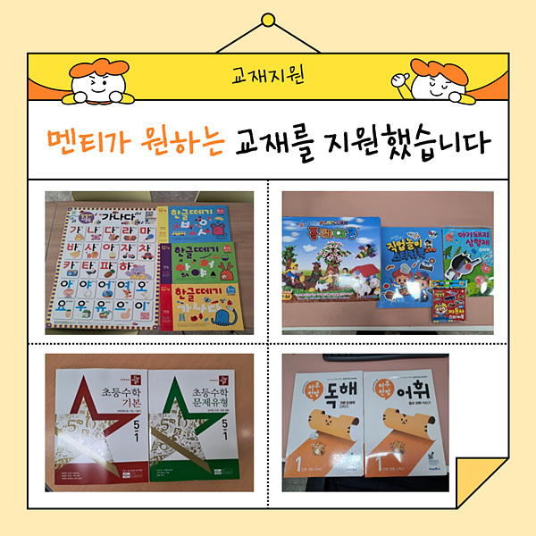 활동에 필요한 교재도 상하반기 각각 1회씩 지원하고 있어 멘티와 보호자가 원하는 교재를 7커플에게 지원했습니다.