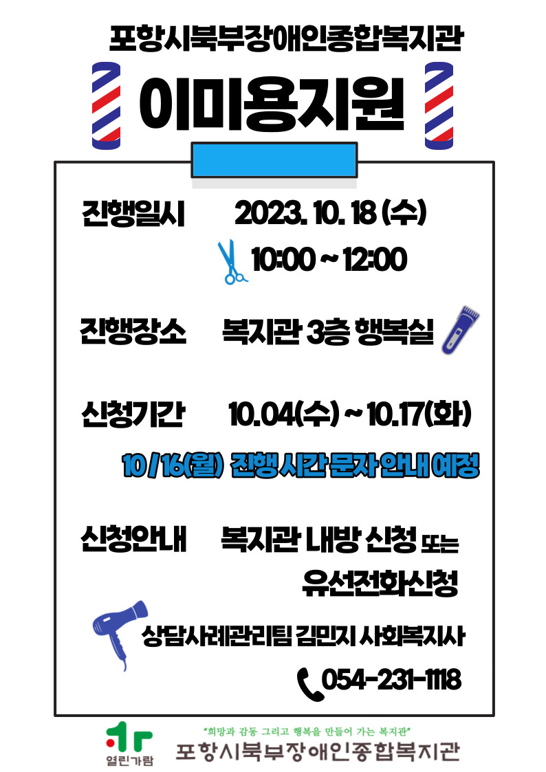 10월 이미용 참여자 모집 최고관리자 상담사례관리팀 0 802 2023.10.04 11:44 <10월 이미용 참여자 모집> * 진행일시 : 2023. 10. 18(수) 10:00 ~ 12:00* 진행장소 : 복지관 3층 행복실* 신청기간 : 10. 04(수) ~ 10.17(화)* 신청방법 : 복지관 내방신청 또는 유선전화신청 (상담사례관리팀 김민지 사회복지사 054-231-1118)