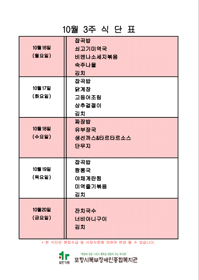 2023년 10월 3주 식단표 안내 최고관리자 기획운영팀 0 1183 2023.10.12 14:30 [2023년 10월 3주 식단표 안내]* 금주 프로그램 이용자 및 가족, 사전이용 신청자 중 식당운영이 진행됩니다.*<10월 16일(월요일) ~ 10월 20일(금요일)>** 본 식단은 원료 수급 및 식당 사정에 따라 변경될 수 있습니다. **
