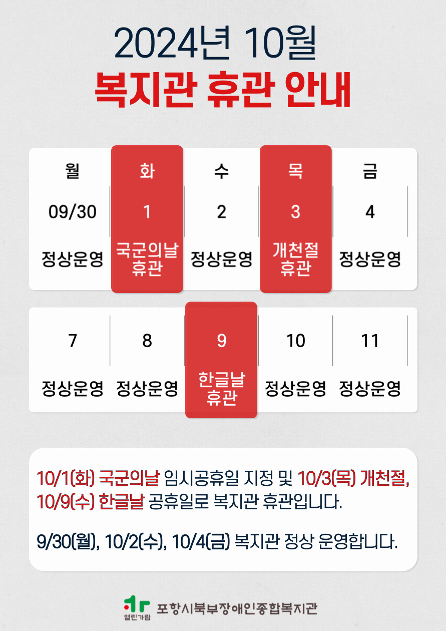 2024년 10월 복지관 휴관 안내 최고관리자 공지 0 349 2024.09.19 09:40 <2024년 10월 복지관 휴관 안내>- 10/1(화) 국군의날 임시공휴일 지정 및 10/3(목) 개천절, 10/9(수) 한글날 공휴일로 복지관 휴관입니다