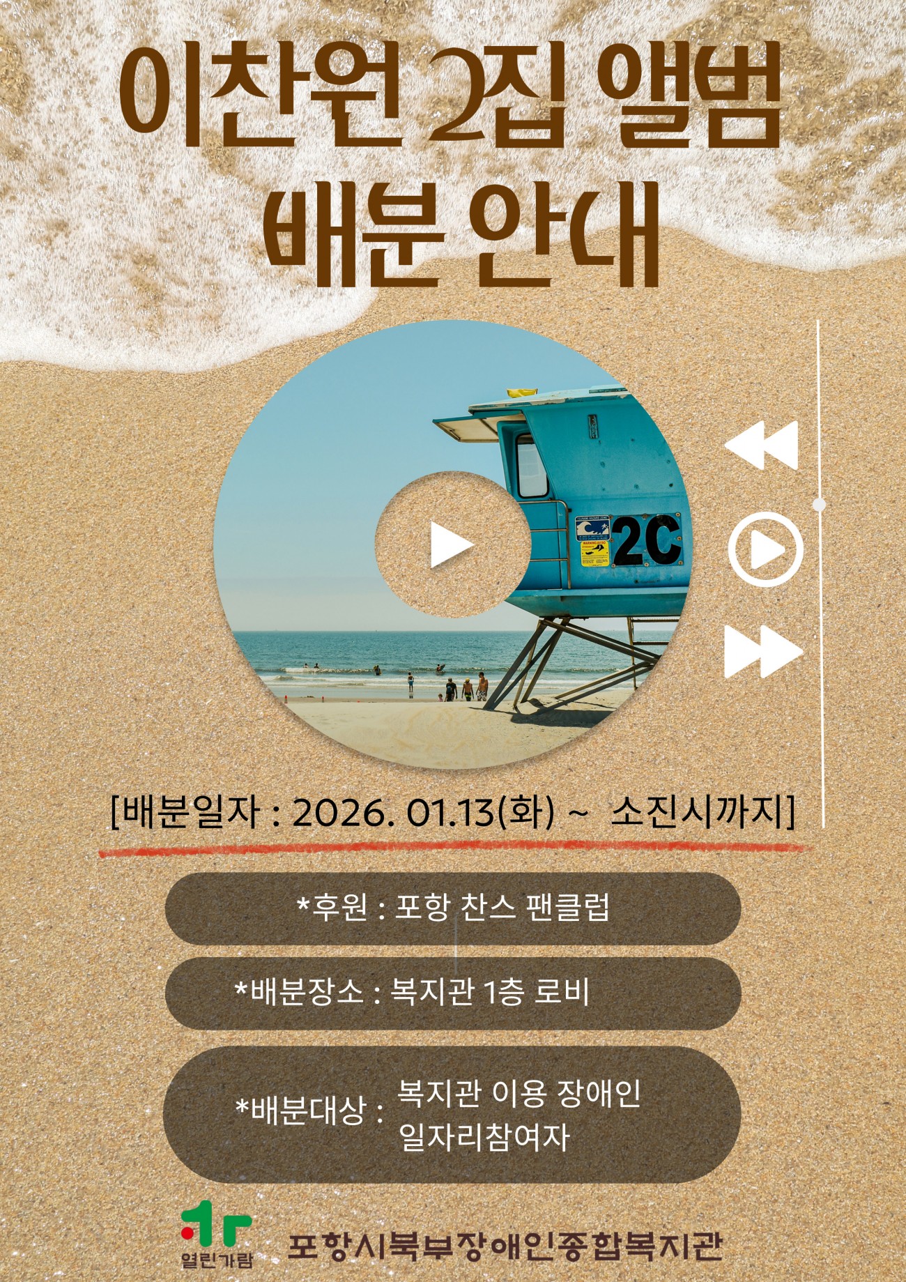 이찬원 2집 앨범 배분 안내 최고관리자 지역사회서비스팀 0 94 01.12 19:01 포항 찬스 팬클럽에서 후원해 주신 이찬원 2집 앨범을 배분합니다!배분일시 : 2026.01.13(화) ~ 소진시까지(선착순)배분장소 : 복지관 1층 로비배분대상 : 복지관 등록 장애인, 일자리 참여자