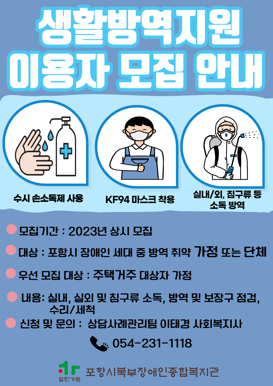 생활방역지원 이용자 모집 안내 최고관리자 0 568 2023.01.18 15:41 생활방역지원 이용자 모집 안내모집기간 : 2023년 상시모집대 상 : 포항시 장애인 세대 중 방역 취약 가정 또는 단체우선모집대상 : 주댁거주 대상자 가정내 용 : 실내, 실외 및 침구류 소독, 방역 및 보장구 점검, 수리/세척신청 및 문의 : 상담사례관리팀 이태경 사회복지사 (054-231-1118)