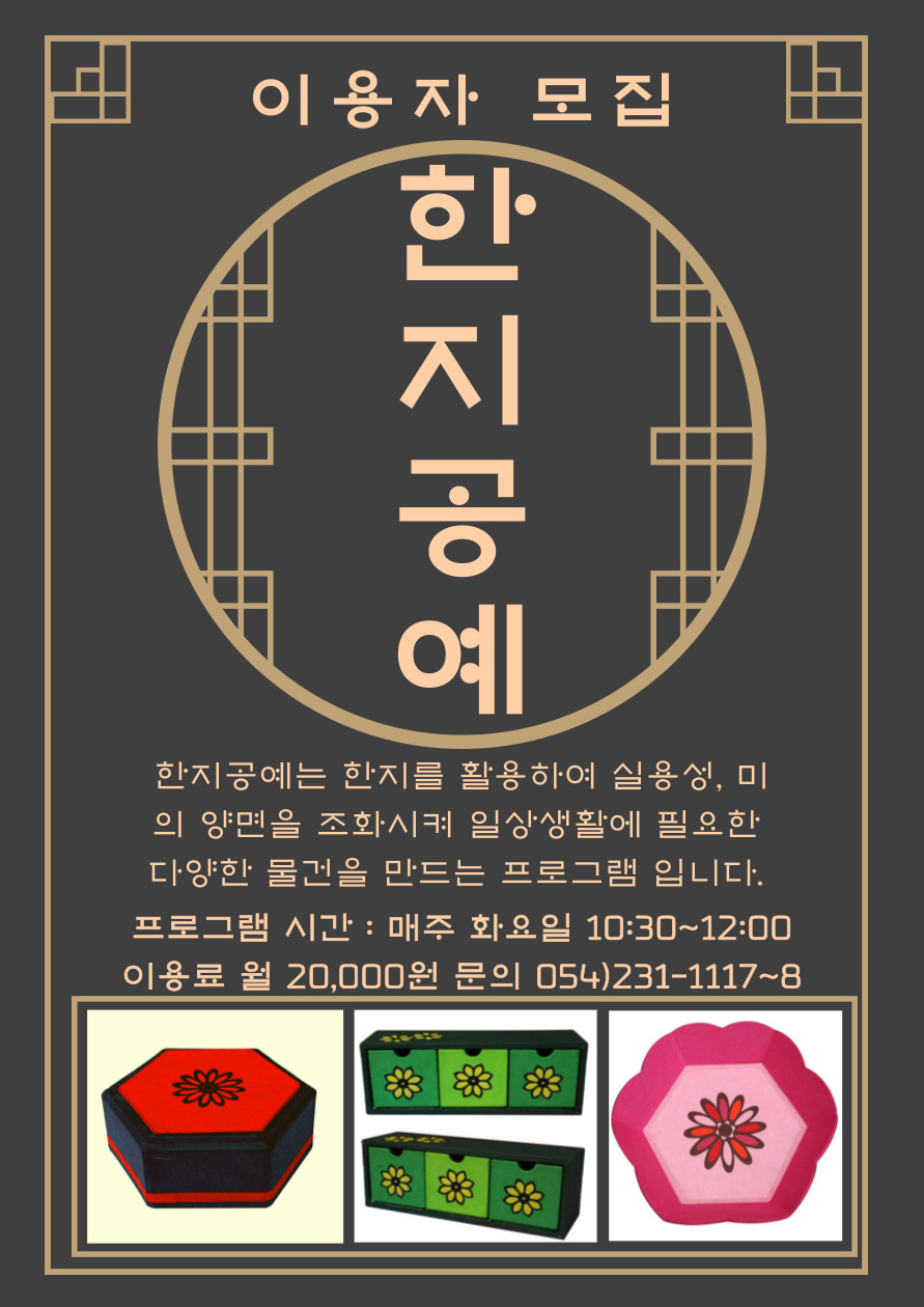 한지공예 이용자 모집 안내 최고관리자 0 797 2023.02.13 14:16 한지공예는 한지를 활용하여 실용성, 미의 양면을 조화시켜 일상생활에 필요한 다양한 물건을 만드는 프로그램입니다.프로그램 시간 : 매주 화요일 10:30 ~ 12:00이용료 : 월 20,000원문의 : 가족평생교육지원팀 054)231-1117~8