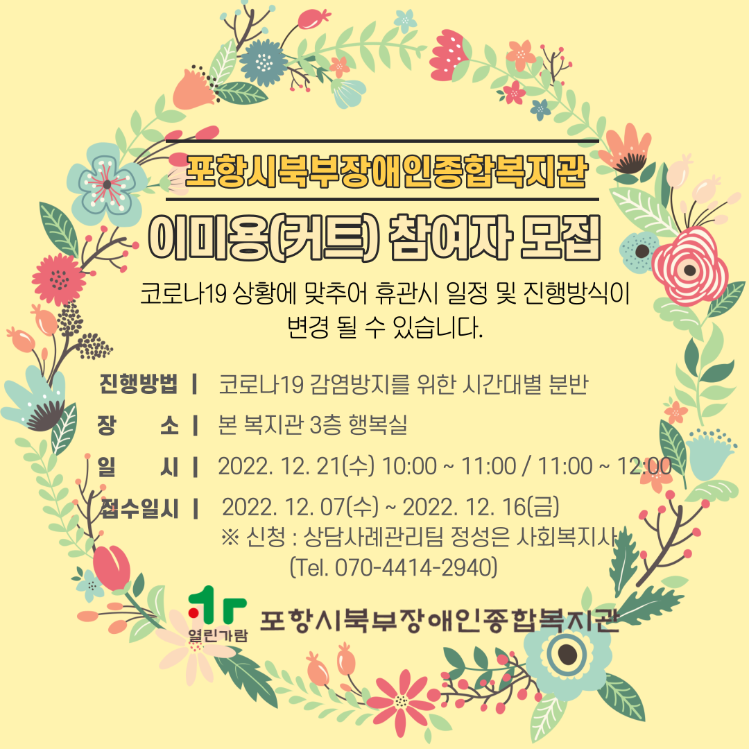 12월 이미용 참여자 모집 안내 최고관리자 0 690 2022.12.06 17:57 [12월 이미용 참여자 모집 안내]진행방법: 코로나19 감염방지를 위한 시간대별 분반장소: 본 복지관 3층 행복실실시일시: 2022.12.21(수) 10:00~11:00/ 11:00~12:00접수일자: 2022.12.07(수) ~ 12.16(금)신청방법: 전화신청(상담사례관리팀 정성은 사회복지사/054-231-1117~8) ※코로나19 상황에 맟추어 휴관시 일정 및 진행방식이 병경될 수 있습니다※