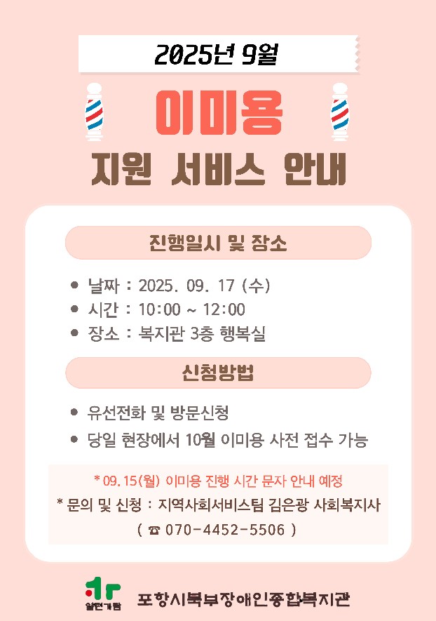 9월 이미용 지원 서비스 안내 최고관리자 0 166 2025.09.04 09:56 <9월 이미용 지원 서비스 안내>* 진행일시 : 2025. 09. 17(수) 10:00 ~ 12:00* 진행장소 : 복지관 3층 행복실* 신청기간 : 2025. 09. 04(월) ~ 09. 20(수)- 09. 15(월) 개인별 미용 시간을 문자로 안내해드릴 예정입니다.- 이미용 진행 당일 사전 접수대장에 성함, 전화번호, 원하는 시간을 적어주시면 10월 이미용 접수가 가능합니다.*문의: 지역사회서비스팀 김은광 사회복지사(070-4452-5506)