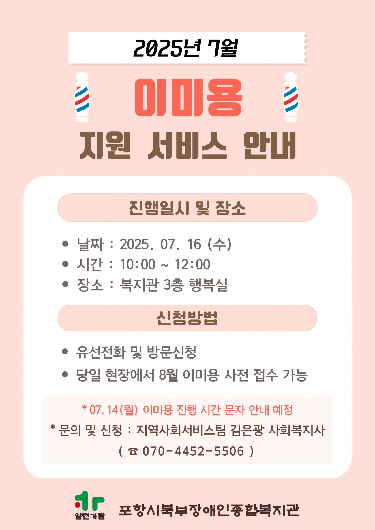 7월 이미용 지원 서비스 안내 최고관리자 0 176 2025.07.10 15:14 <7월 이미용 지원 서비스 안내>* 진행일시 : 2025. 07. 16(수) 10:00 ~ 12:00* 진행장소 : 복지관 3층 행복실* 신청기간 : 2025. 07. 02 (월) ~ 07. 16(수)07. 14(월) 진행시간을 문자로 안내해드릴 예정입니다.이미용 진행 당일 사전 접수대장에 성함, 전화번호, 원하는 시간을 적어주시면 8월 이미용 접수가 가능합니다.