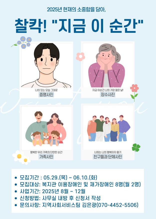 사진촬영사업 [찰칵! "지금 이 순간"] 참여자 모집 최고관리자 0 172 2025.05.29 10:19 <사진촬영사업 참여자 모집>* 모집기간 : 2025. 05. 29(목) ~ 06.10(화)* 모집대상 : 복지관 이용장애인 및 재가장애인 8명(월 2명)* 사업기간 : 2025년 8월 ~ 12월 * 신청방법 : 사무실 내방 후 신청서 작성 * 문의사항 : 지역사회서비스팀 김은광(070-4452-5506)