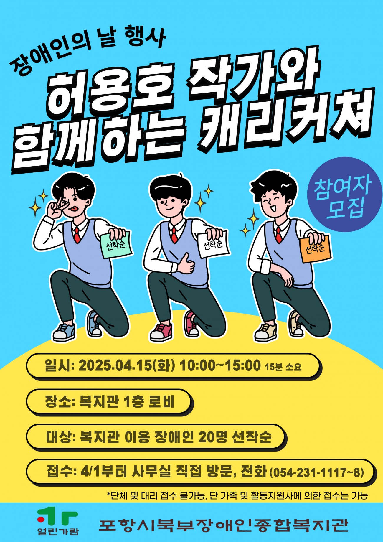 <장애인의 날 행사> 허용호작가와 함께하는 캐리커쳐 참여자 모집 최고관리자 0 189 2025.04.01 10:48 <장애인의 날 행사 >허용호 작가와 함께하는 캐리커쳐 참여자 모집1. 신청: 2025. 04. 01(수) ~ 선착순20명2. 진행일시: 2025. 04. 15(화) 10:00 ~ 15:00 1인 15분 소요3. 신청방법: 복지관 내방하여 신청 또는 전화(054-231-1117~8)*단체 및 대리 접수 불가능, 단 가족 및 활동지원사에 의한 접수는 가능