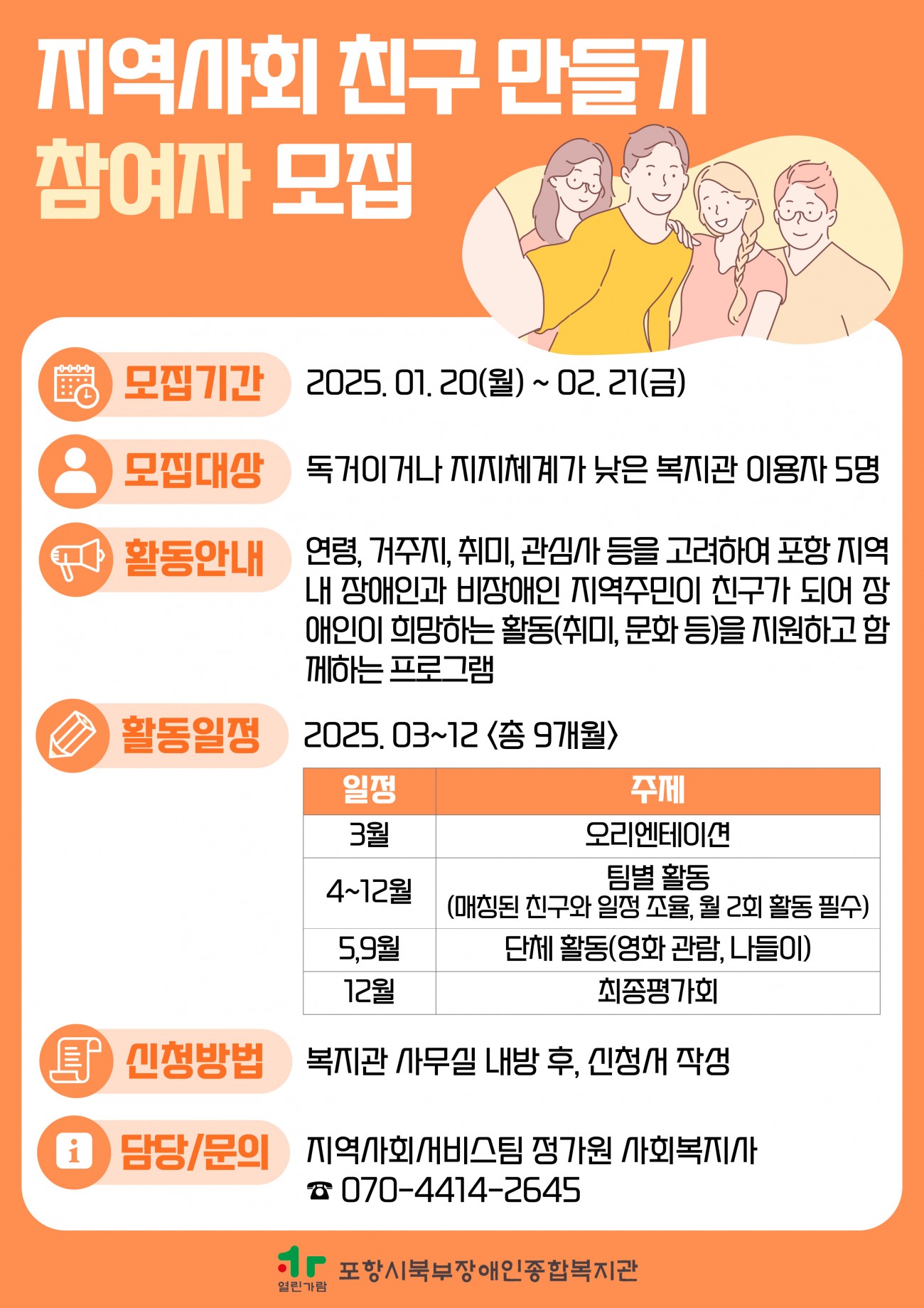 2025년 지역사회친구만들기 참여자 모집 최고관리자 0 241 2025.01.20 10:06 모집기간- 2025.01.20(월) ~ 02.21(금)모집대상- 독거이거나 지지체계가 낮은 복지관 이용자 5명활동안내- 연령, 거주지, 취미, 관심사 등을 고려하여 포항 지역 내 장애인과 비장애인 지역주민이 친구가 되어 장애인이 희망하는 활동(취미, 문화 등)을 지원하고 함께하는 프로그램활동일정- 2025. 03~12 <9개월>- 상세 일정 사진 참고신청방법- 복지관 사무실 내방 후, 신청서 작성문의/신청- 지역사회서비스팀 정가원 사회복지사 ☎ 070-4414-2645