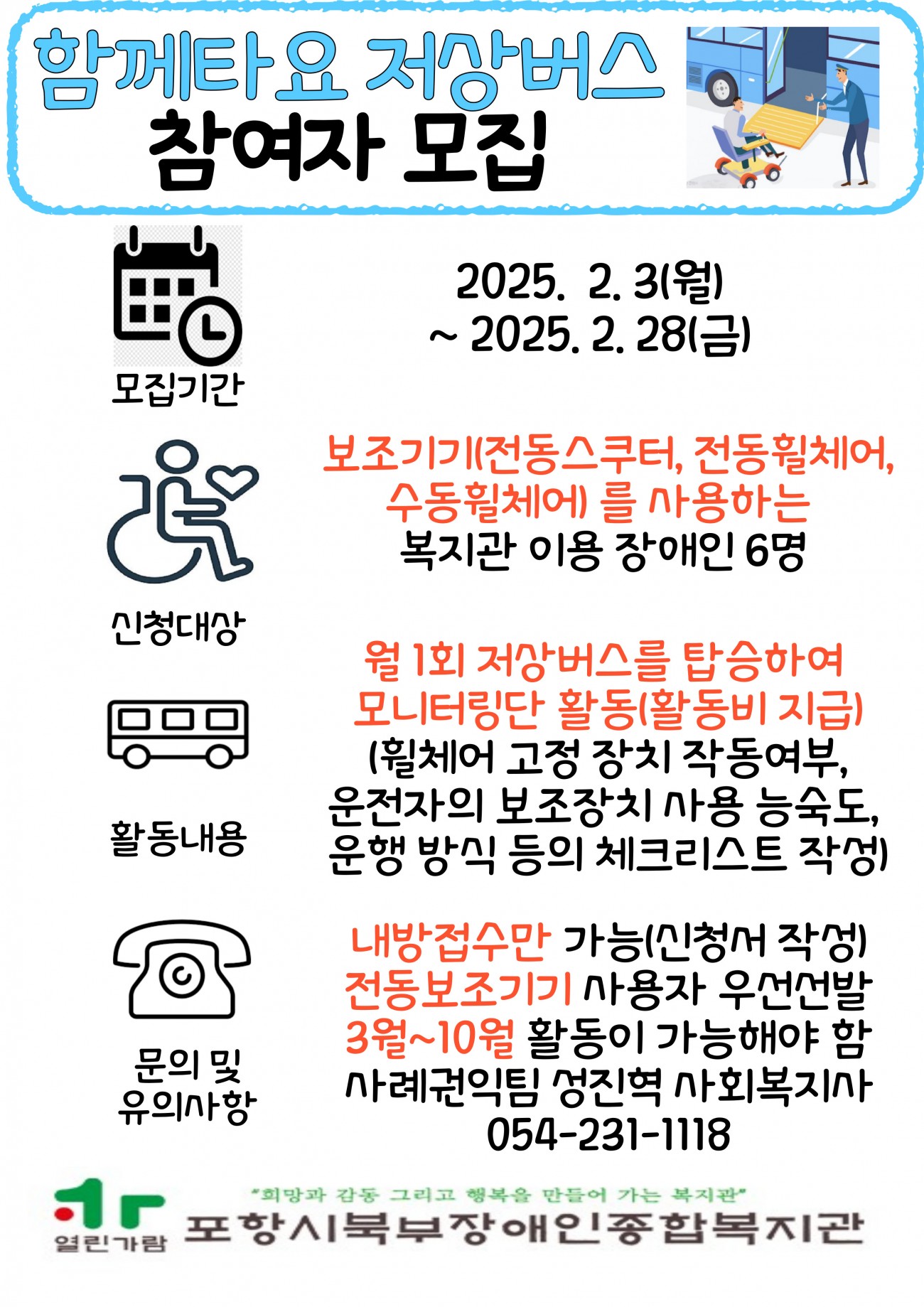 함께타요 저상버스 참여자 모집 최고관리자 0 222 2025.02.03 17:25 신청기간 : 2025.02. 03(월) ~ 2025. 02. 28(금)신청대상 : 보조기기(전동스쿠터, 전동휠체어, 수동휠체어)를 사용하는 복지관 이용장애인6명활동내용 : 월1회 저상버스를 탑승하여 모니터링단 활동(활동비 지급)(휠체어 고정 장치 작동여부, 운전자의 보조장치 사용 능숙도, 운행 방식 등의 체크리스트 작성)문의 및 유의사항 : 내방접수만 가능(신청서작성), 전동보조기기 사용자 우선선발, 3월~10월 활동이 가능해야함사례권익팀 성진혁 사회복지사 054-231-1118