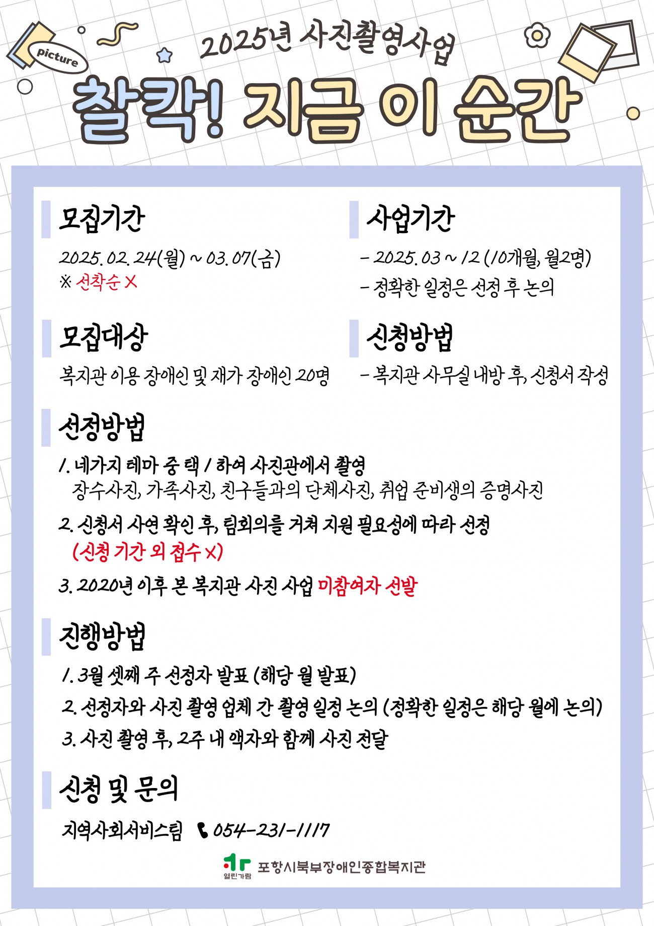 2025년 사진촬영사업 "찰칵! 지금 이 순간" 참여자 모집 최고관리자 0 187 2025.02.25 16:23 사무실 내방하여 신청서 작성하셔야 합니다 (선착순X)아래의 홍보지를 참고하여 많은 신청바랍니다.