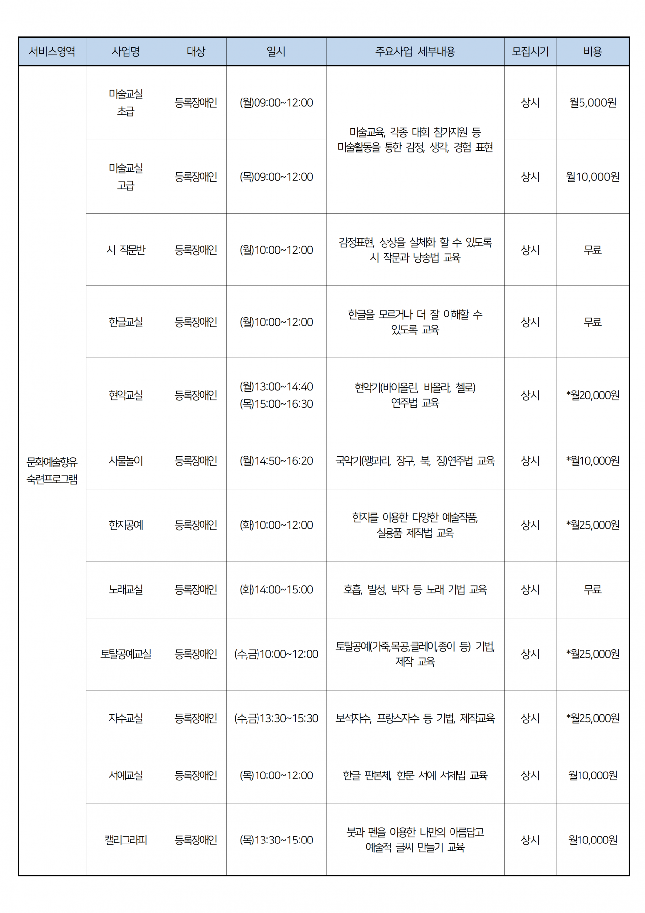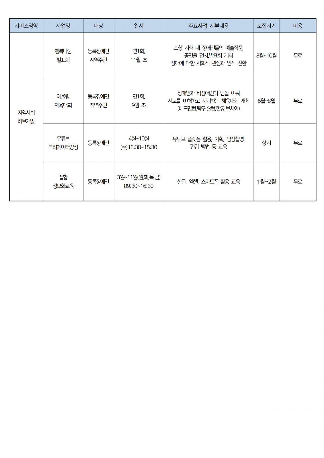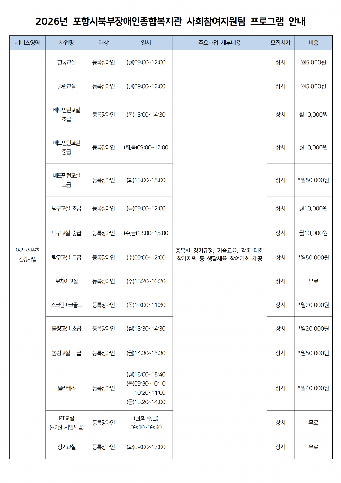 2026년도 프로그램 수강생 모집 안내 최고관리자 0 893 2025.12.03 13:21 [2026년도 포항시북부장애인종합복지관 사회참여지원팀 프로그램 수강생 모집 안내]1. 모집기간 : 2025년 12월 8일(월) ~ 12월 24일(수) *발표 12월 29일(월)2. 모집분야 : 여가스포츠, 문화예술(상세내용 붙임 참조)3. 신청방법 : 포항시북부장애인종합복지관 방문 접수 또는 전화접수 후 수강신청서 작성4. 신청문의 : 054-231-1117 5. 프로그램별 정원 미달 시 해당 프로그램은 폐지됩니다.**2025년도 이용자분들도 2026년도 프로그램에 다시 신청하셔야 됩니다.**