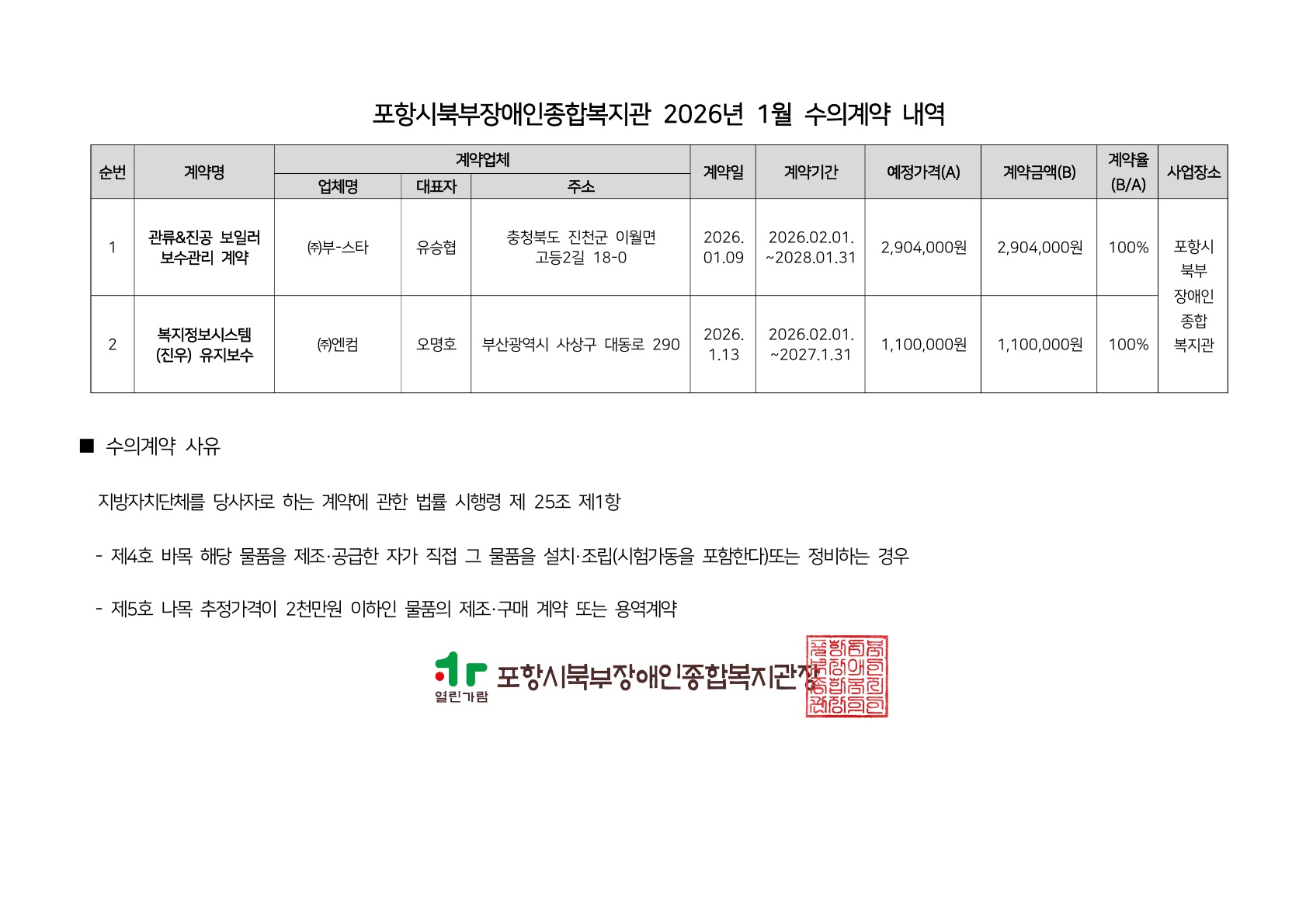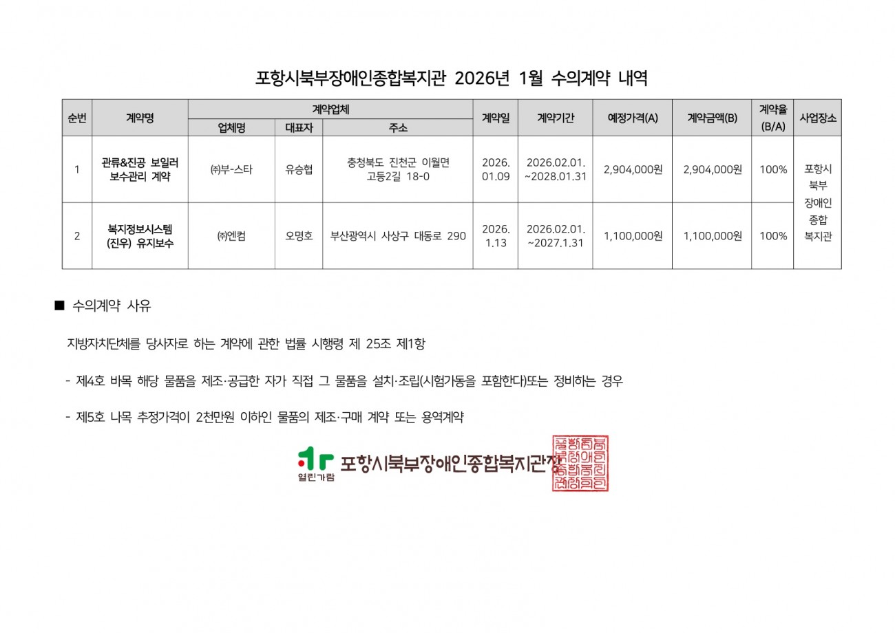 포항시북부장애인종합복지관 2026년 1월 수의계약 내역 공개