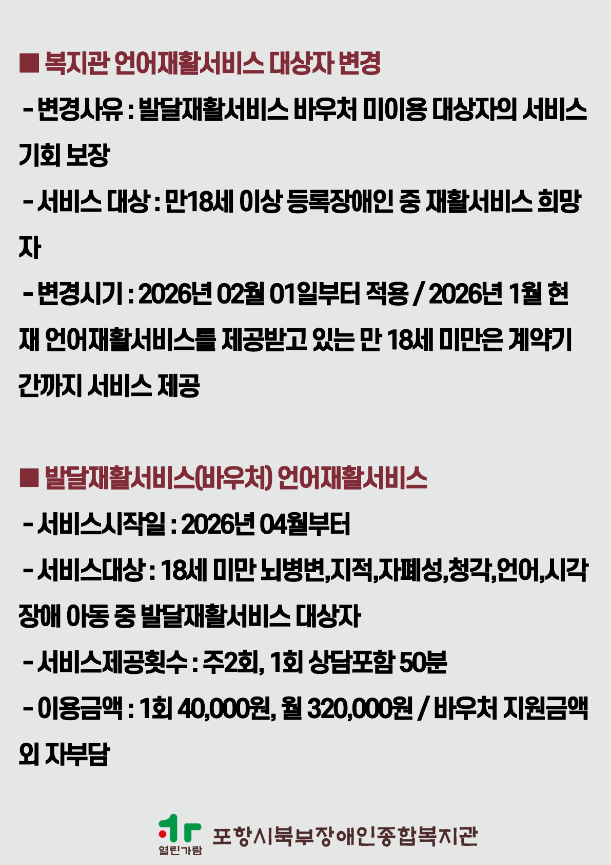 포항시북부장애인종합복지관 재활서비스 운영 변경 사항 공지