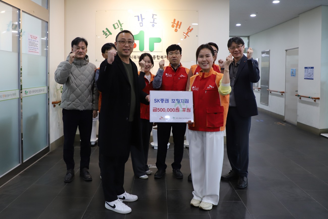 SK증권 포항지점 후원금 전달식 및 자원봉사활동 진행 최고관리자 0 402 2024.11.25 09:19 <SK증권 포항지점 후원금 전달식 및 자원봉사활동 진행>SK증권 포항지점에서 장애인 복지를 위해본 복지관에 500,000원의 후원금을 지원해주셨습니다.소중히 전달해주신 후원금은 지역장애인을 위해 사용됩니다.또한 SK증권 포항지점에서는 감각통합실에서 교구 소독 및 세척 자원봉사활동을 진행하였습니다.