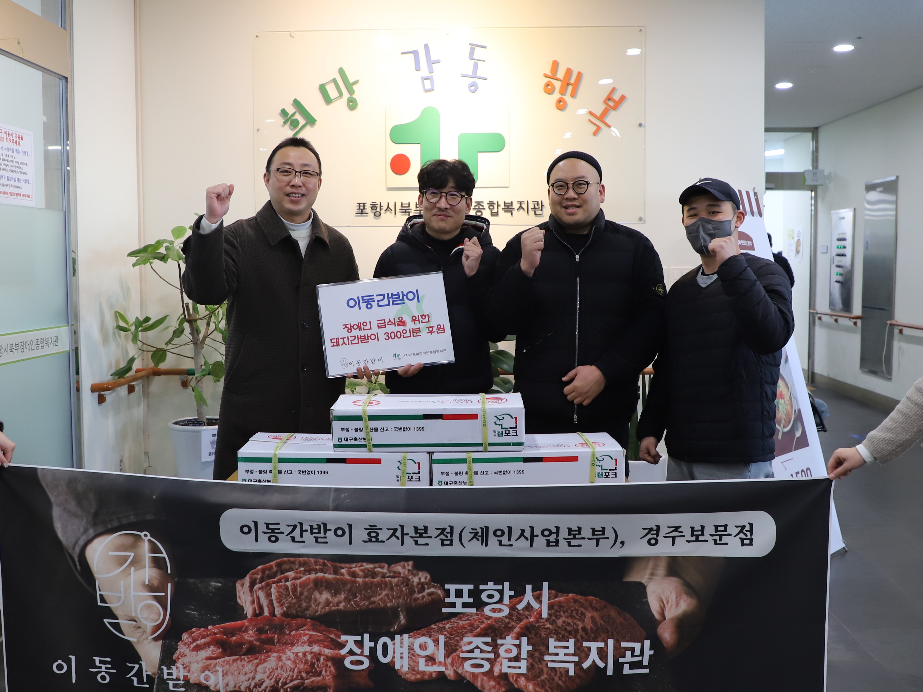 이동간받이 효자본점 후원품 전달식 진행 최고관리자 0 227 01.17 13:06 <이동간받이 효자본점 진행>이동간받이 효자본점에서 장애인 복지를 위해본 복지관에 돼지간받이 250인분을 지원해주셨습니다.소중히 전달해주신 후원금은 장애인 급식에 사용됩니다.