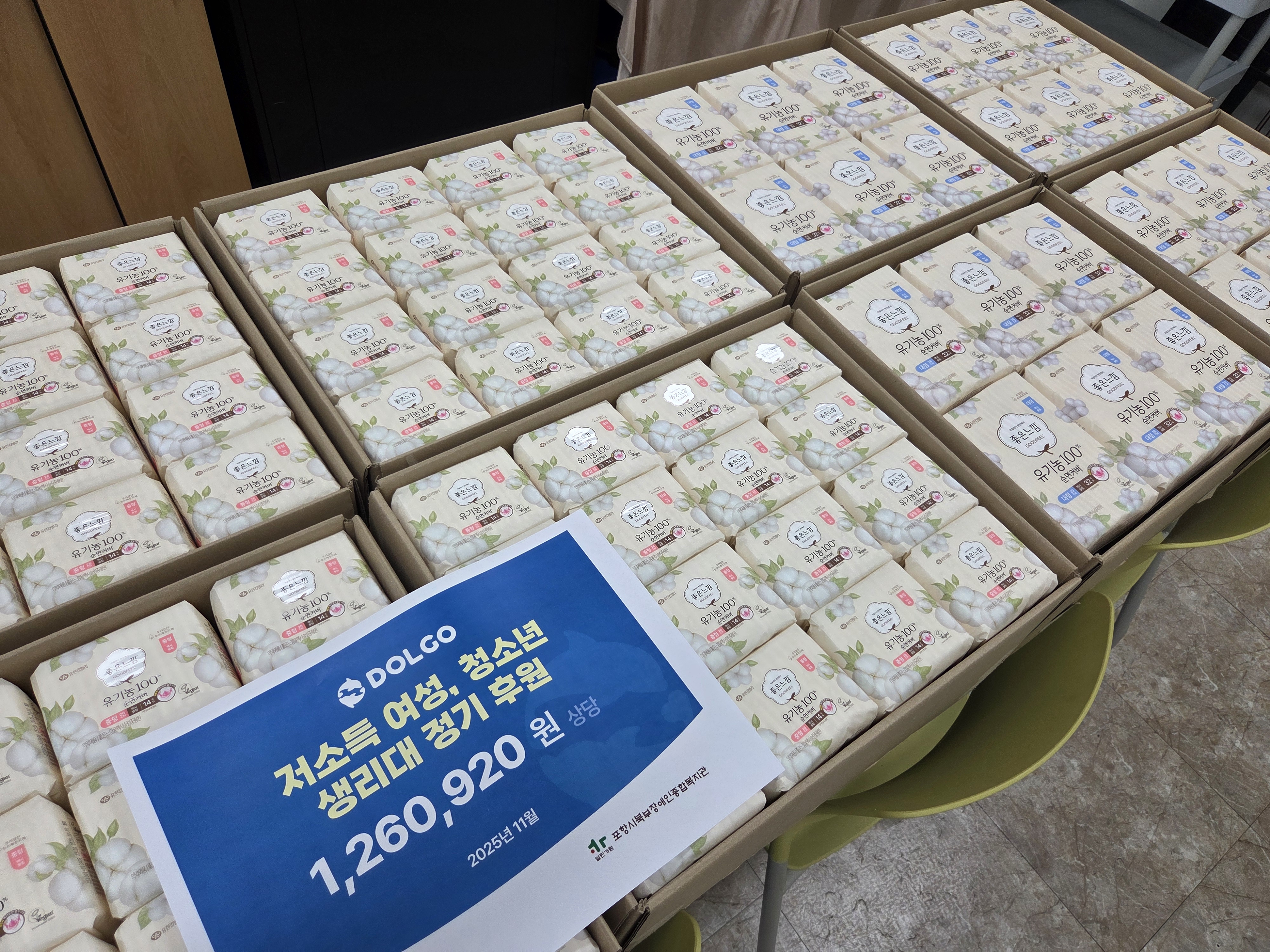 본 복지관은 기부플랫폼 돌고(DOLGO)를 통해 총 1,260,920원 상당의 생리대를 후원받았습니다.