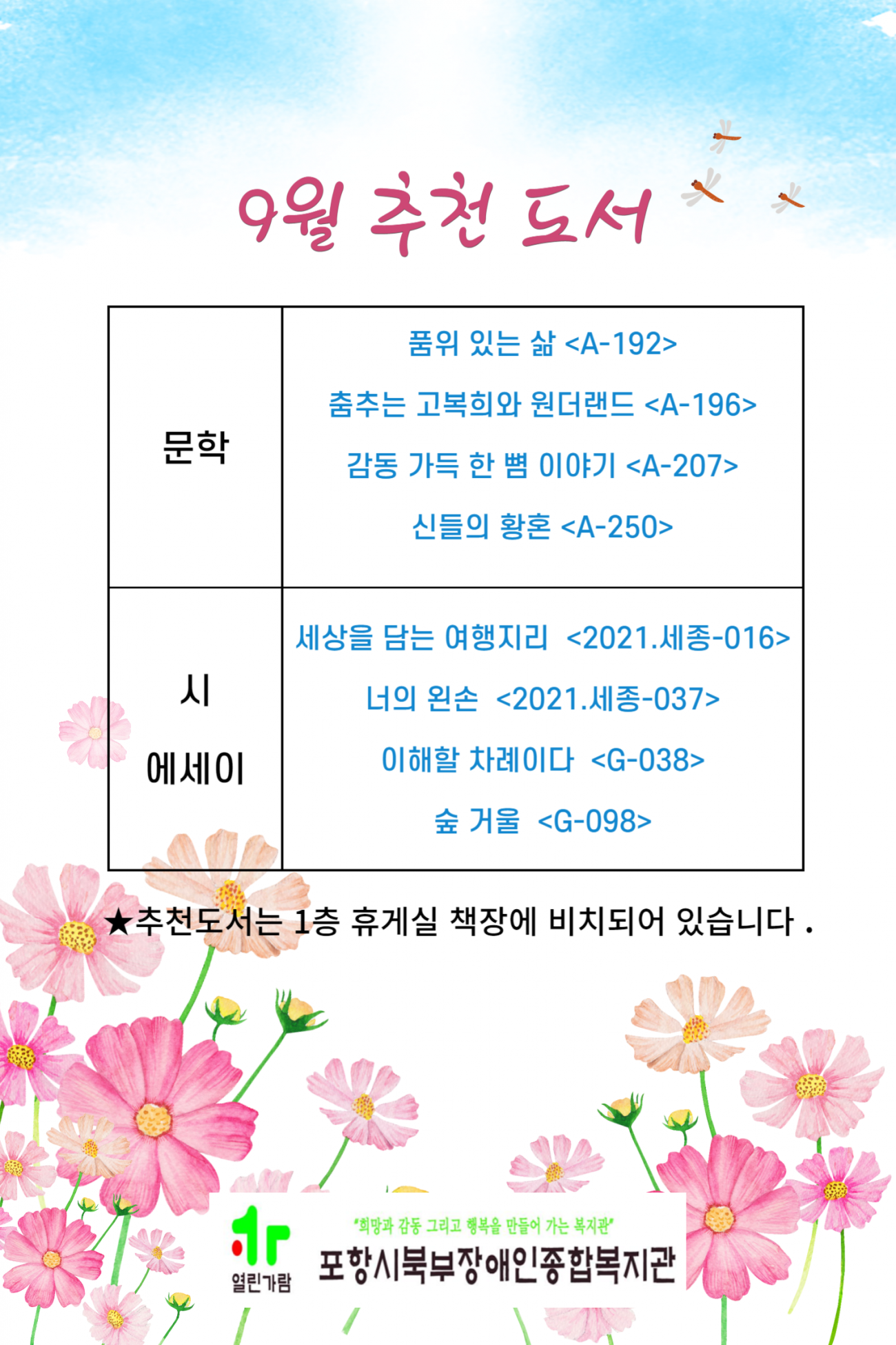 9월 추천도서 안내 최고관리자 기획운영팀 0 900 2023.09.04 09:05 [9월 추천도서]9월 추천도서입니다.목록 참고하시어 많은 대여 부탁드립니다:)이외에도 1층 휴게실에 대여 가능한 여러 종류의 도서가 비치되어 있으니 이용에 참고 부탁드립니다.문의 : 기획운영팀 김민채(070-4452-0403)