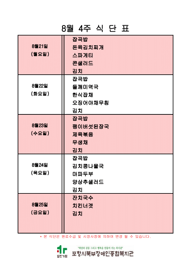 2023년 8월 4주 식단표 안내 최고관리자 기획운영팀 0 1114 2023.08.17 15:15 [2023년 8월 4주 식단표 안내]* 금주 프로그램 이용자 및 가족, 사전이용 신청자 중 식당운영이 진행됩니다.*<08월 21일(월요일) ~ 08월 25일(금요일)>** 본 식단은 원료 수급 및 식당 사정에 따라 변경될 수 있습니다. **