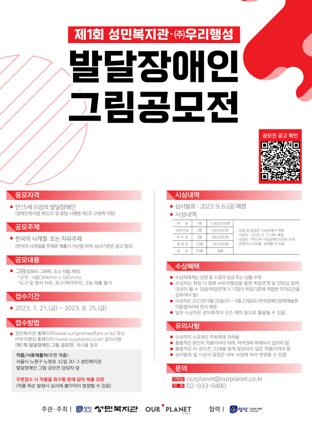 「제1회 발달장애인」 그림 공모전 안내 최고관리자 직업지원팀 0 981 2023.07.25 18:47 「제1회 발달장애인」 그림 공모전 안내* 응모자격 : 만 15세 이상의 발달장애인 * 공모기간 : 2023. 7. 21(금) ~ 2023. 8. 25(금)* 공모주제 : 한국의 사계절 또는 자유주제* 공모내용 : 그림(컴퓨터 그래픽, 조소 작품 제외) , 4절(394mm*545mm)* 문 의 : 직업지원팀 전호성 팀장(070-4409-6982)