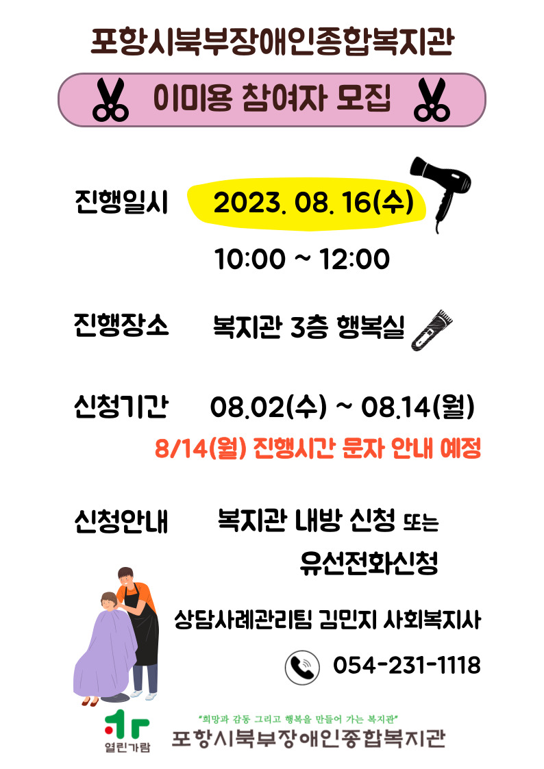 8월 이미용 참여자 모집 최고관리자 상담사례관리팀 0 955 2023.08.02 10:27 <8월 이미용 참여자 모집> * 진행일시 : 2023. 08. 16(수) 10:00 ~ 12:00* 진행장소 : 복지관 3층 행복실* 신청기간 : 08. 02(수) ~ 08. 14(월)* 신청방법 : 복지관 내방신청 또는 유선전화신청 (상담사례관리팀 김민지 사회복지사 054-231-1118)