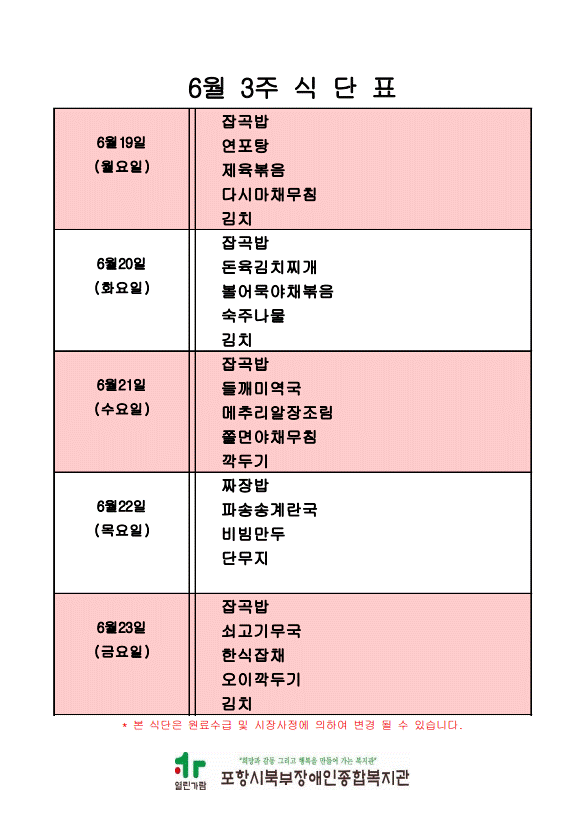 ** 본 식단은 원료 수급 및 식당 사정에 따라 변경될 수 있습니다. **