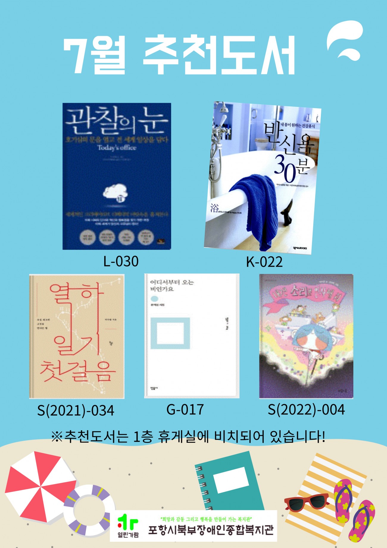 7월 추천도서 최고관리자 기획운영팀 0 987 2023.07.03 14:28 [7월 추천도서]7월 추천도서입니다.목록 참고하시어 많은 대여 부탁드립니다:)이외에도 1층 휴게실에 대여 가능한 여러 종류의 도서가 비치되어 있으니 이용에 참고 부탁드립니다.문의 : 기획운영팀 김민채(070-4452-0403)