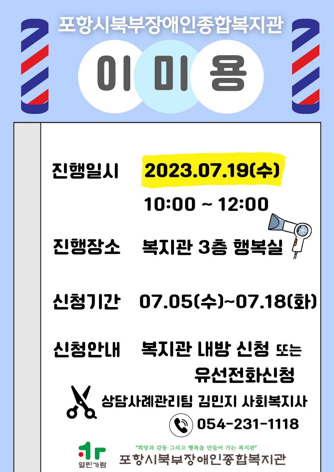 7월 이미용 참여자 모집 최고관리자 상담사례관리팀 0 837 2023.07.05 09:33 <7월 이미용 참여자 모집> * 진행일시 : 2023. 07. 19(수) 10:00 ~ 12:00* 진행장소 : 복지관 3층 행복실* 신청기간 : 07. 05 (수) ~ 07. 18 (화)* 신청방법 : 복지관 내방신청 또는 유선전화신청 (상담사례관리팀 김민지 사회복지사 054-231-1118)