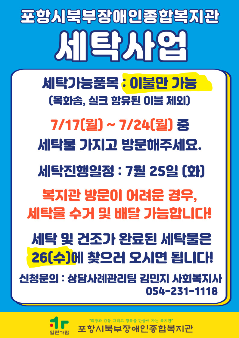 포항시북부장애인종합복지관 세탁사업 안내 최고관리자 상담사례관리팀 0 792 2023.07.10 17:18 <세탁사업 안내> * 진행일시 : 2023년 7월 25일(화)* 7/17(월) ~ 7/24(월) 세탁물을 가지고 방문해주세요. - 이불만 가능합니다. <방문 어려운 경우 세탁물 수거 및 배달 가능>* 신청 및 문의 : 상담사례관리팀 김민지(054-231-1118)** 완료된 세탁물은 26(수)일 이후 방문하셔서 찾아가시면 됩니다^^