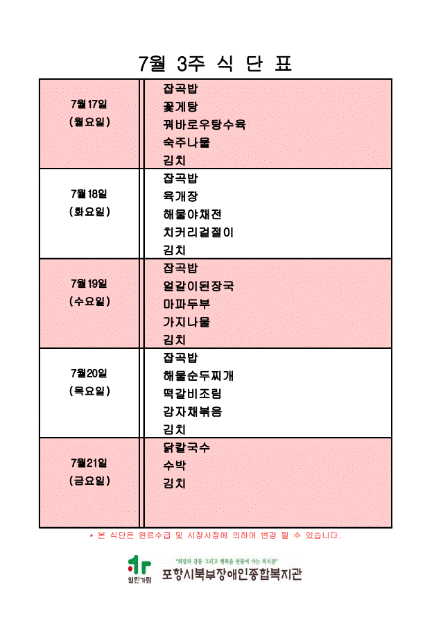 2023년 7월 3주 식단표 안내 최고관리자 기획운영팀 0 1045 2023.07.13 15:30 [2023년 7월 3주 식단표 안내]* 금주 프로그램 이용자 및 가족, 사전이용 신청자 중 식당운영이 진행됩니다.*<07월 17일(월요일) ~ 07월 21일(금요일)>** 본 식단은 원료 수급 및 식당 사정에 따라 변경될 수 있습니다. **