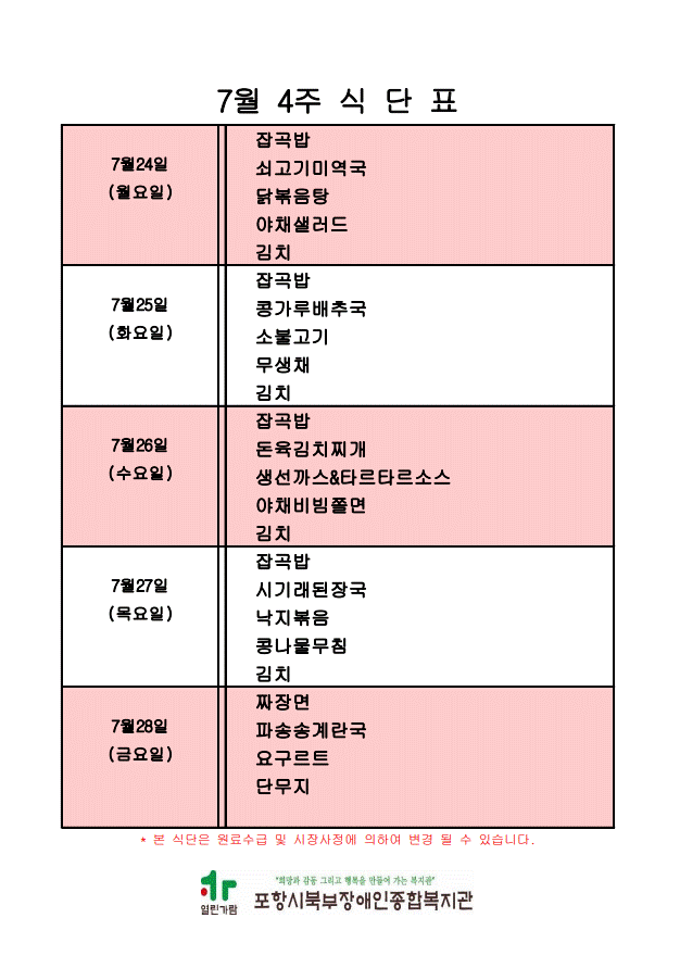 2023년 7월 4주 식단표 안내 최고관리자 기획운영팀 0 1108 2023.07.20 15:19 [2023년 7월 4주 식단표 안내]* 금주 프로그램 이용자 및 가족, 사전이용 신청자 중 식당운영이 진행됩니다.*<07월 24일(월요일) ~ 07월 28일(금요일)>** 본 식단은 원료 수급 및 식당 사정에 따라 변경될 수 있습니다. **