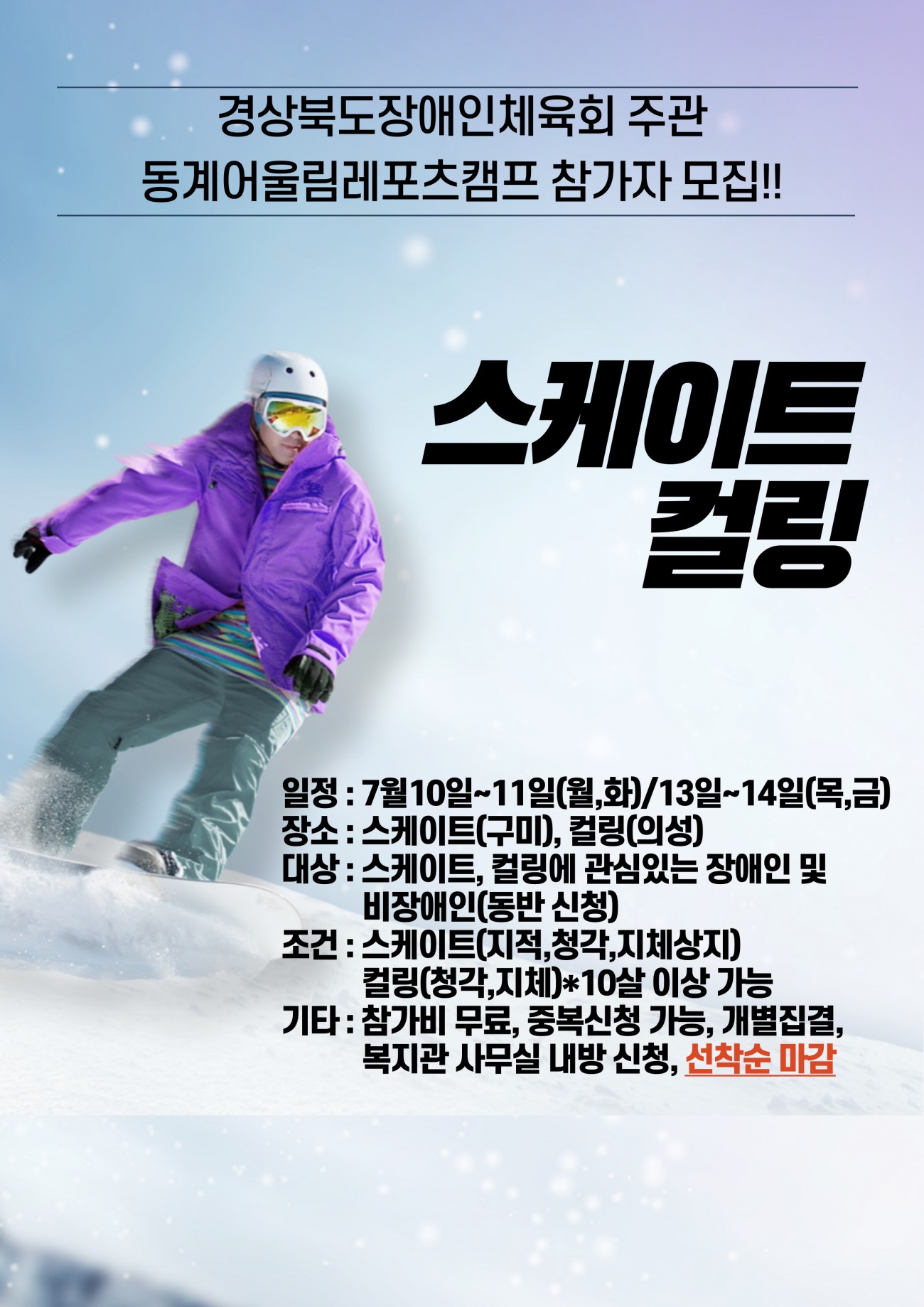 경상북도장애인체육회 주관 동계어울림레포츠캠프(스케이트, 컬링) 참가자 모집 최고관리자 가족평생교육지원팀 0 773 2023.06.07 13:04 <경상북도장애인체육회 주관 동계어울림레포츠캠프(스케이트, 컬링) 참가자 모집>* 일 정: 2023. 07. 10 ~ 07. 11(월, 화) / 2023. 07. 13 ~ 07. 14(목, 금)* 장 소: 스케이트(구미), 컬링(의성)* 대 상: 스케이트, 컬링에 관심있는 장애인 및 비장애인(동반 신청)* 조 건: 스케이트(지적, 청각, 지체상지) 컬링(청각, 지체)*10살 이상 가능*기 타: 참가비 무료, 중복신청 가능, 개별집결, 복지관 사무실 내방 신청, 선착순 마감