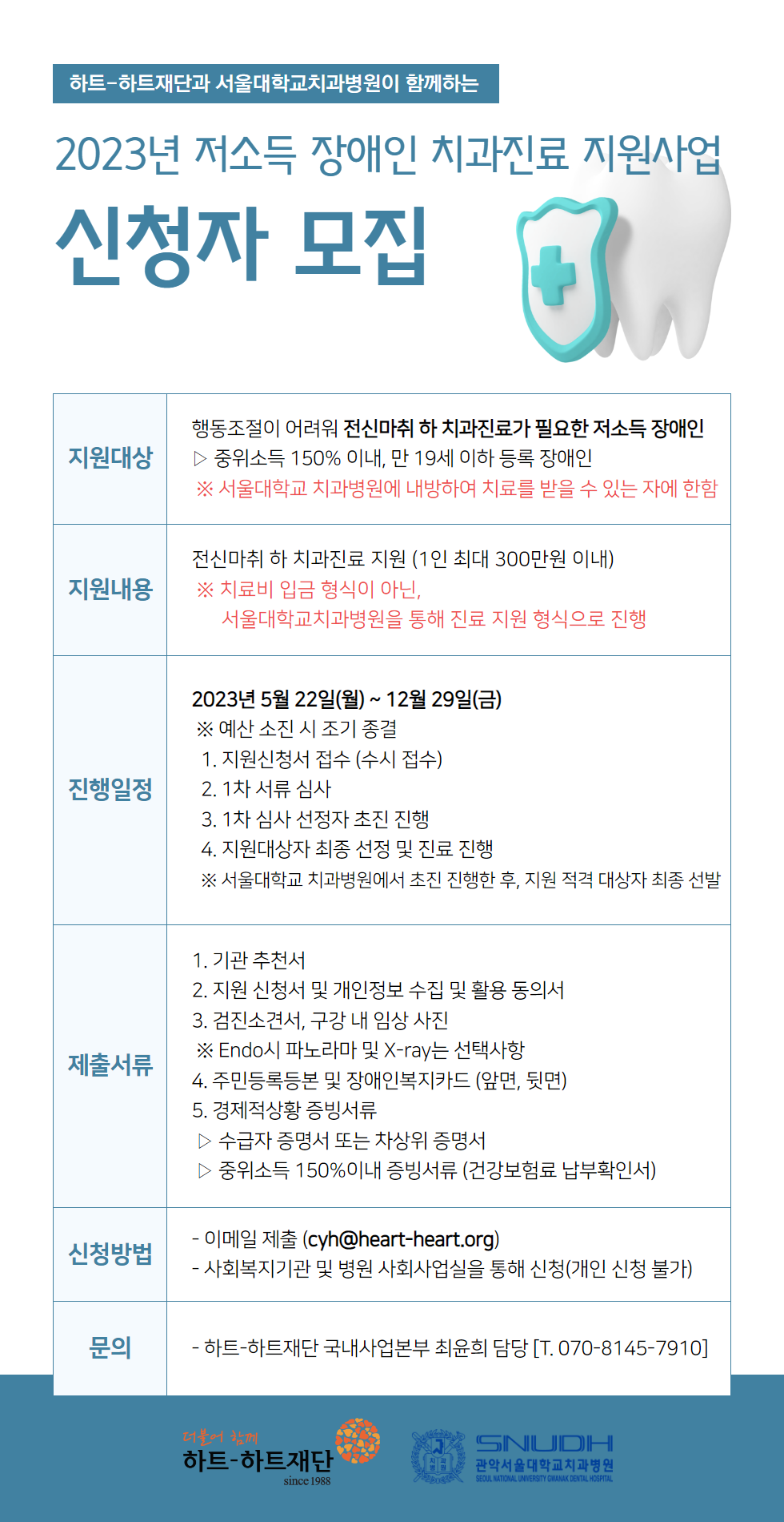 2023 「저소득 장애인 치과진료 지원사업』 모집 안내 최고관리자 기획운영팀 0 1062 2023.06.14 16:43 2023 「저소득 장애인 치과진료 지원사업』 모집 안내 - 지원 대상: 행동조절이 어려워 전신마취 하 치과진료가 필요한 저소득 장애인 ( 중위소득 150% 이내, 만 19세 이하 등록 장애인)- 지원 내용: 전신마취 하 치과 진료비 지원(1人 최대 200만원 이내)- 신청 기간: 2023. 05 22(월) ~ 2023. 12. 29(금)- 신청 방법: 세부 내용 포스터 참조- 문 의: 국내사업본부 최윤희 담당(070-8145-7910)