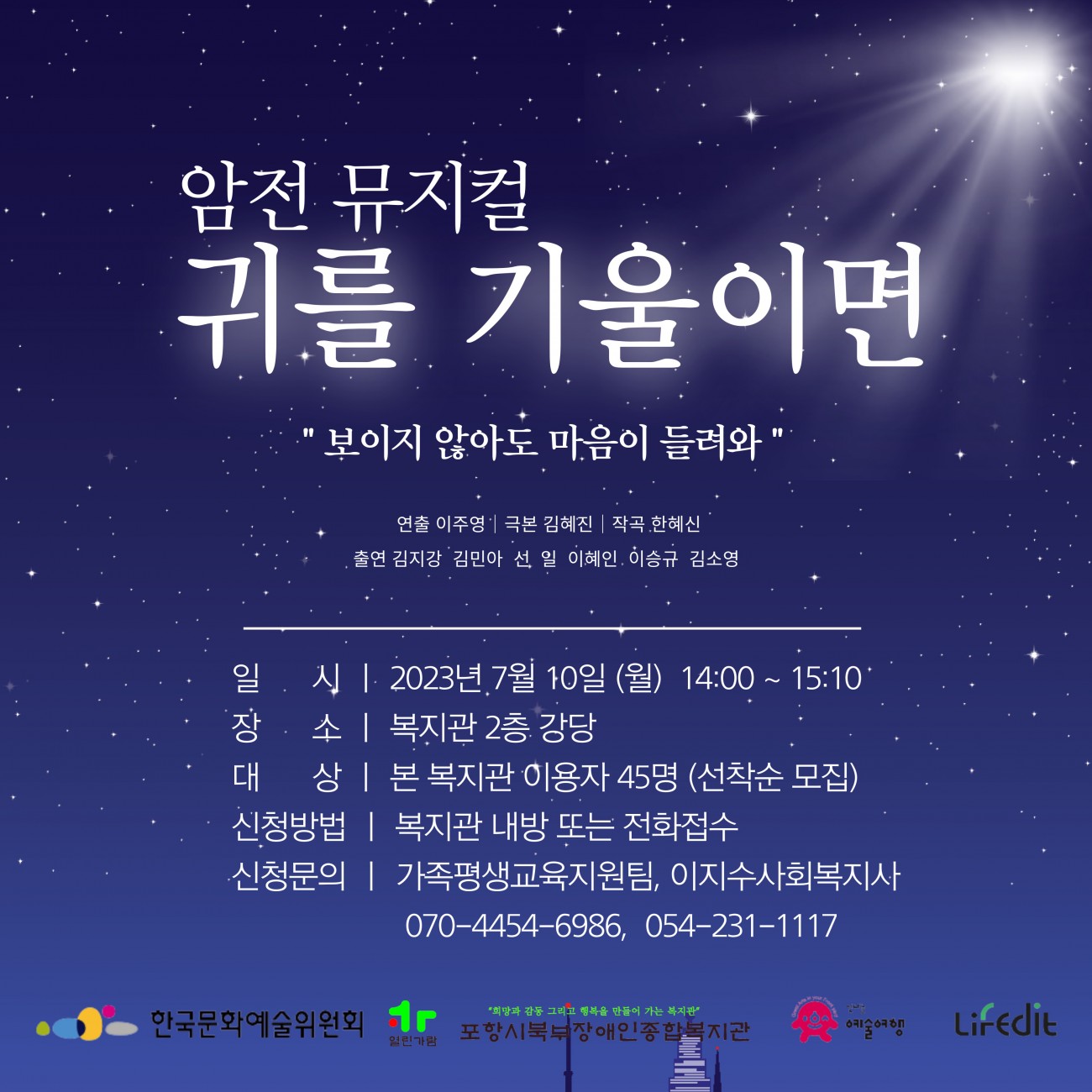 북부네문화체험 암전뮤지컬 '귀를 기울이면' 안내 최고관리자 가족평생교육지원팀 0 794 2023.06.15 11:28 [북부네문화체험 암전뮤지컬 '귀를 기울이면']일시 : 2023. 07. 10(월) 14:00 ~ 15:10대상 : 본 복지관 이용자 45명(선착순 모집)신청 : 가족평생교육지원팀 이지수 사회복지사(070-4454-6986)