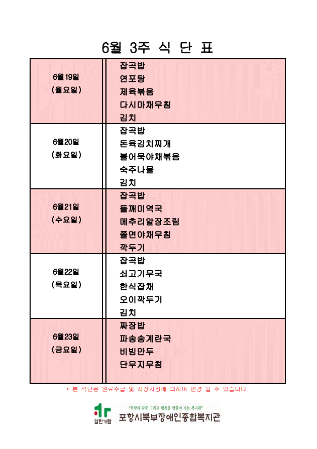 2023년 6월 3주 식단표 안내 최고관리자 기획운영팀 0 1191 2023.06.15 18:59 [2023년 6월 3주 식단표 안내]* 금주 프로그램 이용자 및 가족, 사전이용 신청자 중 식당운영이 진행됩니다.*<06월 19일(월요일) ~ 06월 23일(금요일)>** 본 식단은 원료 수급 및 식당 사정에 따라 변경될 수 있습니다. **
