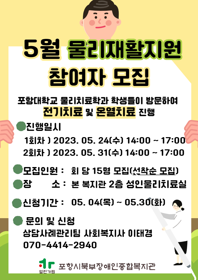 5월 물리재활지원 참여자 모집 재안내 최고관리자 상담사례관리팀 0 883 2023.05.11 15:19 <포항대학교 물리치료학과와 함께하는 5월 '물리재활지원' 참여자 모집>* 신청기간: 05월 04일(목) ~ 05월 30일(화)* 진행일시: 2023년 05월 24일(수) 14:00 ~ 17:00 2023년 05월 31일(수) 14:00 ~ 17:00* 모집인원: 회당 15명 모집(선착순)* 장 소: 2층 성인물리치료실* 문 의: 상담사례관리팀 사회복지사 이태경(070-4414-2940)