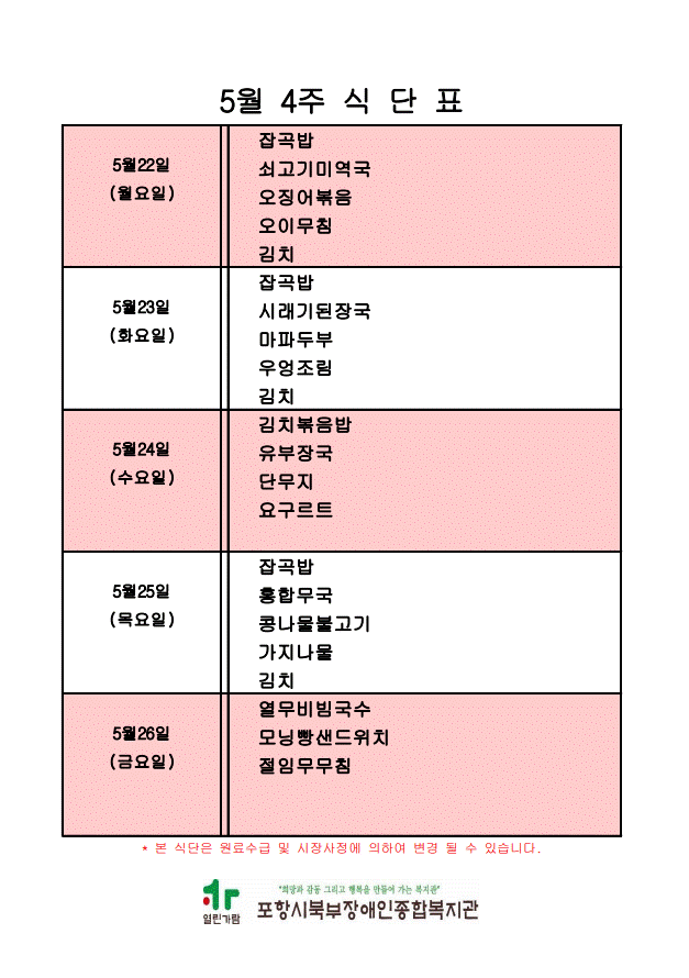 2023년 5월 4주 식단표 안내 최고관리자 기획운영팀 0 1039 2023.05.18 17:01 [2023년 5월 4주 식단표 안내]* 금주 프로그램 이용자 및 가족, 사전이용 신청자 중 식당운영이 진행됩니다.*<05월 22일(월요일) ~ 05월 26일(금요일)>** 본 식단은 원료 수급 및 식당 사정에 따라 변경될 수 있습니다. **