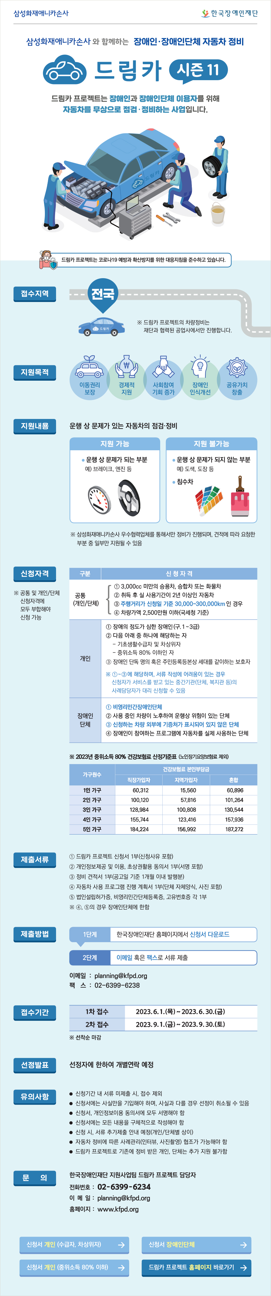 장애인, 장애인단체 자동차 정비 드림카 프로젝트 시즌11 안내 최고관리자 기획운영팀 0 934 2023.06.05 10:33 <장애인, 장애인단체 자동차 정비 드림카 프로젝트 시즌11 안내>* 지원내용: 운행 상 문제가 있는 자동차의 점검·정비* 1차 접수: 2023. 06. 01(목) ~ 2023. 06. 30(금) 2차 접수: 2023. 09. 01(금) ~ 2023. 09. 30(토)* 신청자격: 포스터 참조* 문 의: 상담·사례관리팀 박성주 팀장(070-4409-6978)
