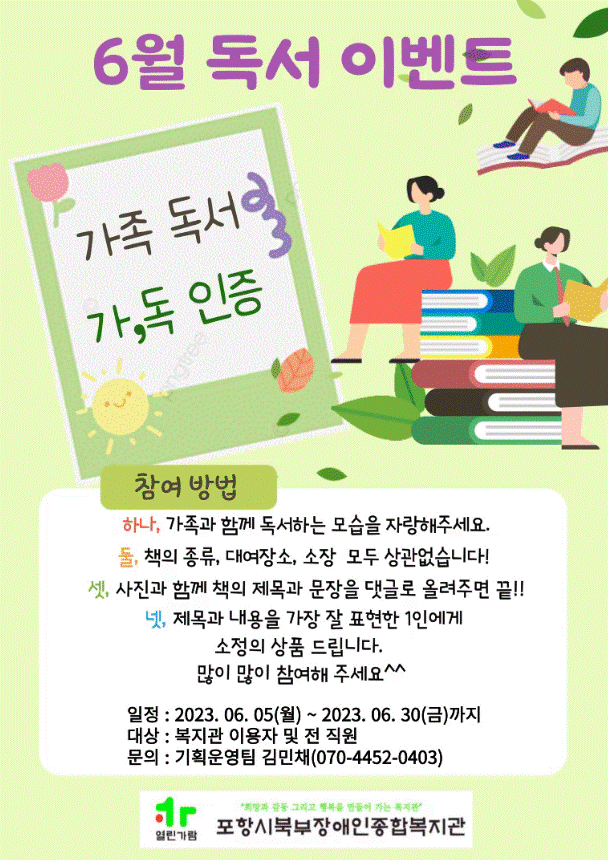 6월 독서이벤트 안내 최고관리자 기획운영팀 0 1024 2023.06.05 10:51 <6월 독서 이벤트 안내>몸과 마음의 계절, 6월을 맞아 복지관에서 가족과 함께 책 읽는 시간을 가져보시길 바라면서 작은 이벤트를 준비했습니다.많은 분들의 관심과 참여 부탁드립니다.* 인증샷은 가족 중 누구라도 상관없으며, 되도록이면 얼굴이 정면으로 보이지 않게해주세요!* 일정: 2023. 06. 05(월) ~ 2023. 06. 30(금)* 대상: 복지관 이용자 및 전 직원* 문의: 기획운영팀 김민채(070-4452-0403)