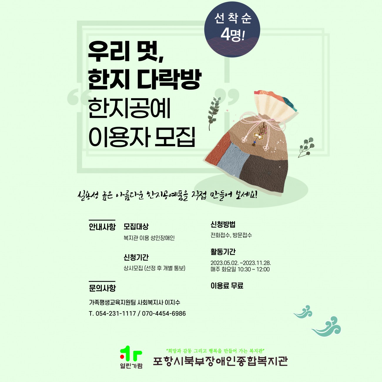 한지공예 이용자 모집 최고관리자 가족평생교육지원팀 0 908 2023.05.11 09:11 <한지공예 이용자 모집>* 모집대상: 복지관 이용 성인 장애인* 신청기간: 상시모집(선정 후 개별 통보)* 활동기간: 2023.05.02 ~ 2023.11.26* 신청방법: 방문·전화 접수* 문 의: 가족평생교육지원팀 사회복지사 이지수(054-231-1117 / 070-4454-6986)