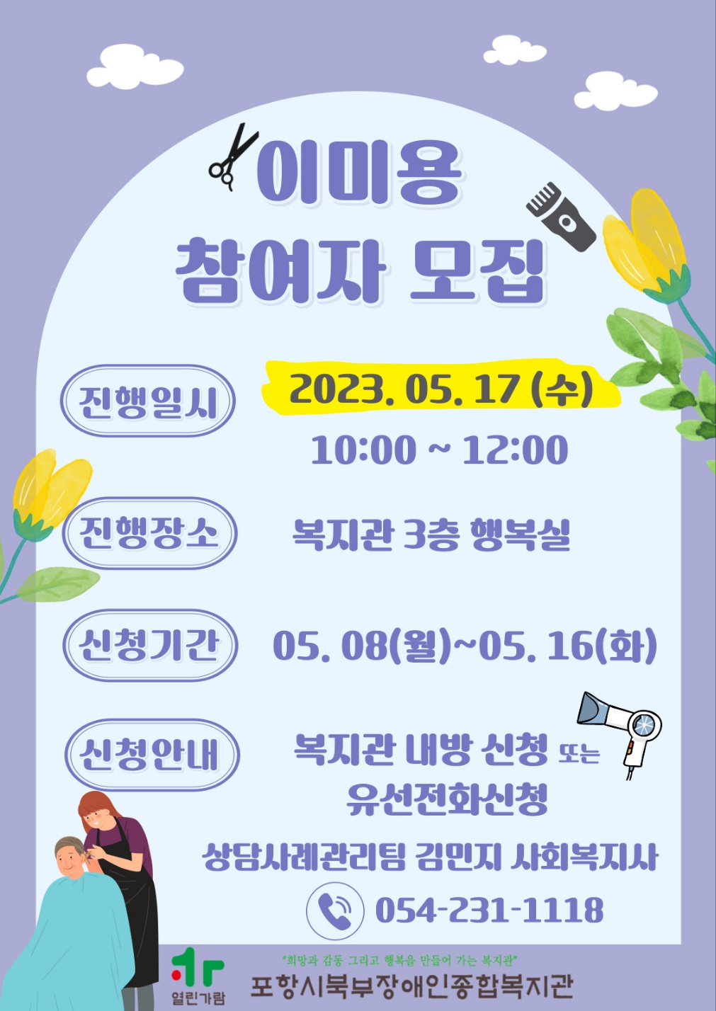 5월 이미용 참여자 모집 최고관리자 상담사례관리팀 0 844 2023.05.11 15:05 <5월 이미용 참여자 모집> * 진행일시 : 2023. 05. 17(수) 10:00 ~ 12:00* 진행장소 : 복지관 3층 행복실* 신청기간 : 05. 08 (월) ~ 05. 16 (화)* 신청방법 : 복지관 내방신청 또는 유선전화신청 (상담사례관리팀 김민지 사회복지사 054-231-1118)