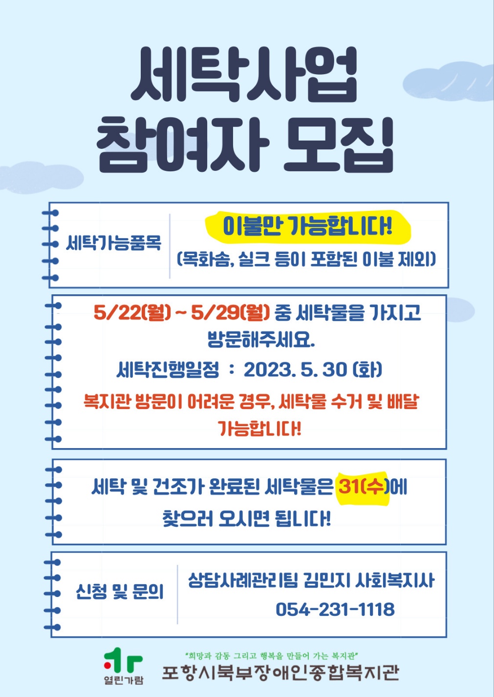 포항시북부장애인종합복지관 세탁사업 안내 최고관리자 상담사례관리팀 0 783 2023.05.11 15:10 <세탁사업 안내> * 진행일시 : 2023년 5월 30일(화)* 5/22(월) ~ 5/29(월) 세탁물을 가지고 방문해주세요. - 이불만 가능합니다. <방문 어려운 경우 세탁물 수거 및 배달 가능>* 신청 및 문의 : 상담사례관리팀 김민지(054-231-1118)** 완료된 세탁물은 31(수)일 이후 방문하셔서 찾아가시면 됩니다^^